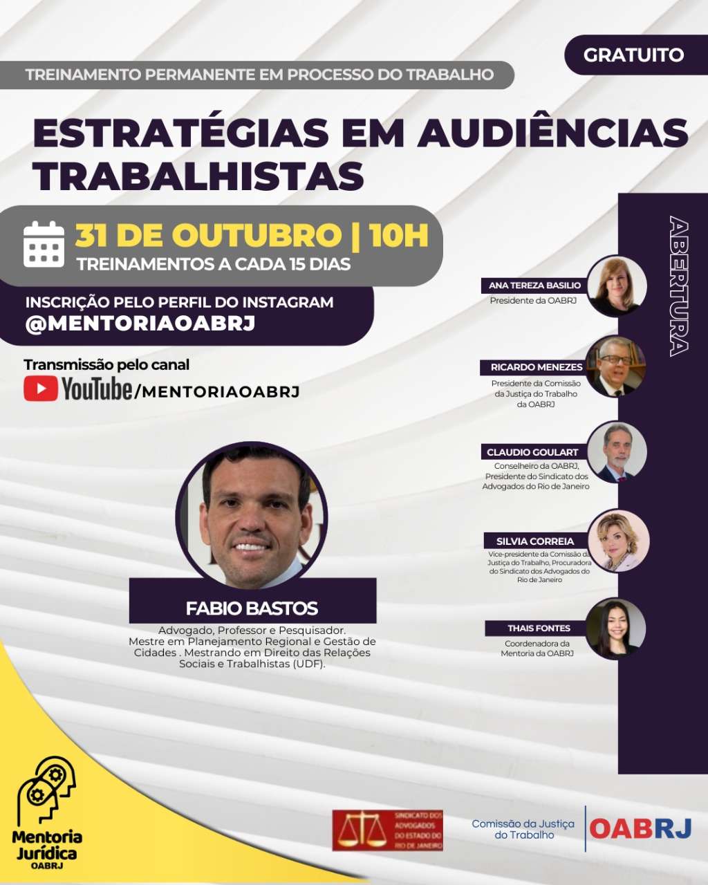Também estarão no encontro virtual e gratuito, o presidente da comissão da Justiça do Trabalho, Ricardo Menezes, o presidente do Sindicato dos Advogados, Claudio Goulart, a vice-presidente da comissão da Justiça do Trabalho, Silvia Correia, a Coordenadora da Mentoria da OAB-RJ, Thais Fontes, e o advogado Fabio Bastos.