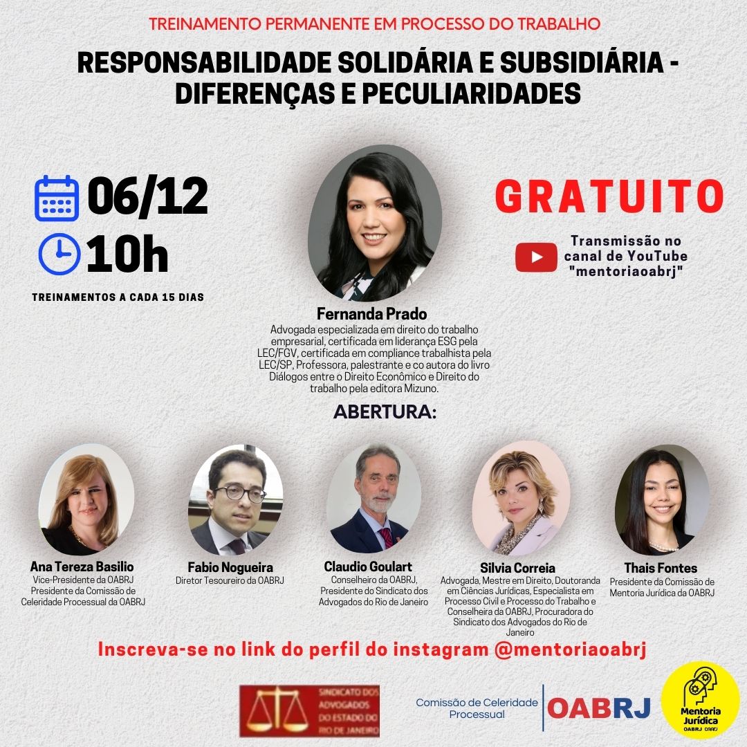 Vice-presidente da OAB-RJ, sócia do Basilio Advogados e presidente da comissão de celeridade processual, Ana Tereza Basílio vai proferir a palestra de abertura do Treinamento Permanente em Processo do Trabalho, nesta sexta, às 10h, pelo canal YouTube mentoriaoabrj, com o tema ” Responsabilidade Solidária e Subsidiária- Diferenças e Peculiaridades “.