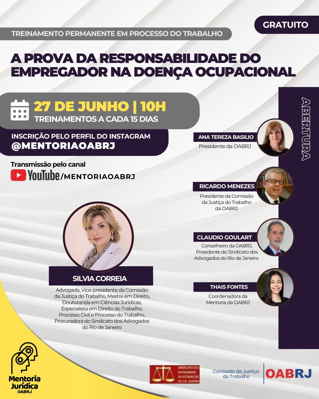 Também estarão no encontro virtual, o presidente da comissão da Justiça do Trabalho, Ricardo Menezes, a vice-presidente, Silvia Correia, o conselheiro da OAB-RJ e presidente do Sindicato dos Advogados do Rio de Janeiro, Claudio Goulart, e a Coordenadora da Mentoria, Thais Fontes.