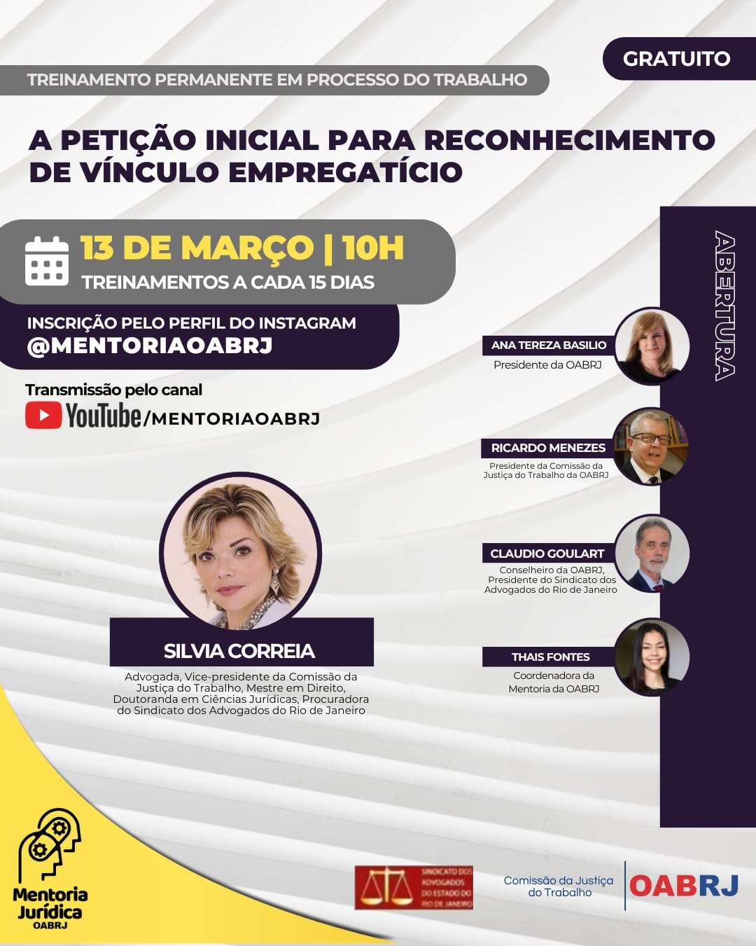 Presidente da OAB-RJ, Ana Tereza Basílio vai proferir a palestra de abertura do Treinamento Permanente em Processo do Trabalho, nesta sexta-feira, dia 13 de março, às 10h, pelo canal YouTube mentoriaoabrj, com o tema “A petição inicial para reconhecimento de vínculo empregatício”.