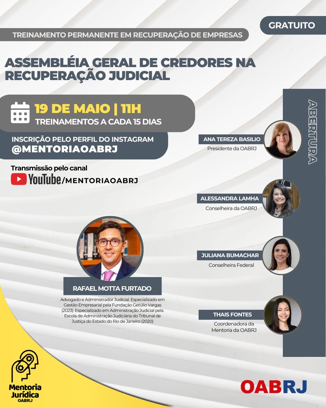 Também estarão no encontro virtual e gratuito, a Coordenadora da Mentoria da OAB-RJ, Thais Fontes, a conselheira da seccional, Alessandra Lamha, a conselheira federal, Juliana Bumachar, e o advogado Rafael Motta Furtado.