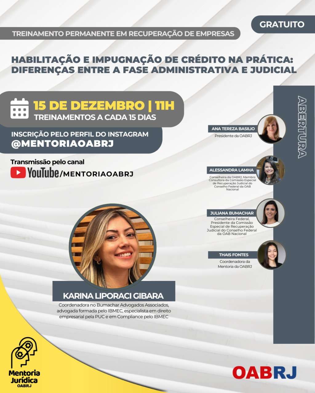 Também estarão no encontro virtual e gratuito, a presidente da comissão de Recuperação Judicial do Conselho Federal da OAB, Juliana Buchamar, a conselheira da comissão, Alessandra Lamha, a Coordenadora da Mentoria da OAB-RJ, Thais Fontes, e a advogada Karina Gibara.