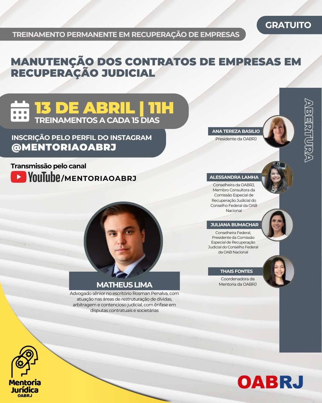 Também estarão no encontro virtual e gratuito, a coordenadora da Mentoria da OAB-RJ, Thais Fontes, as advogadas Alessandra Lamha, Juliana Buchamar e o advogado Matheus Lima.