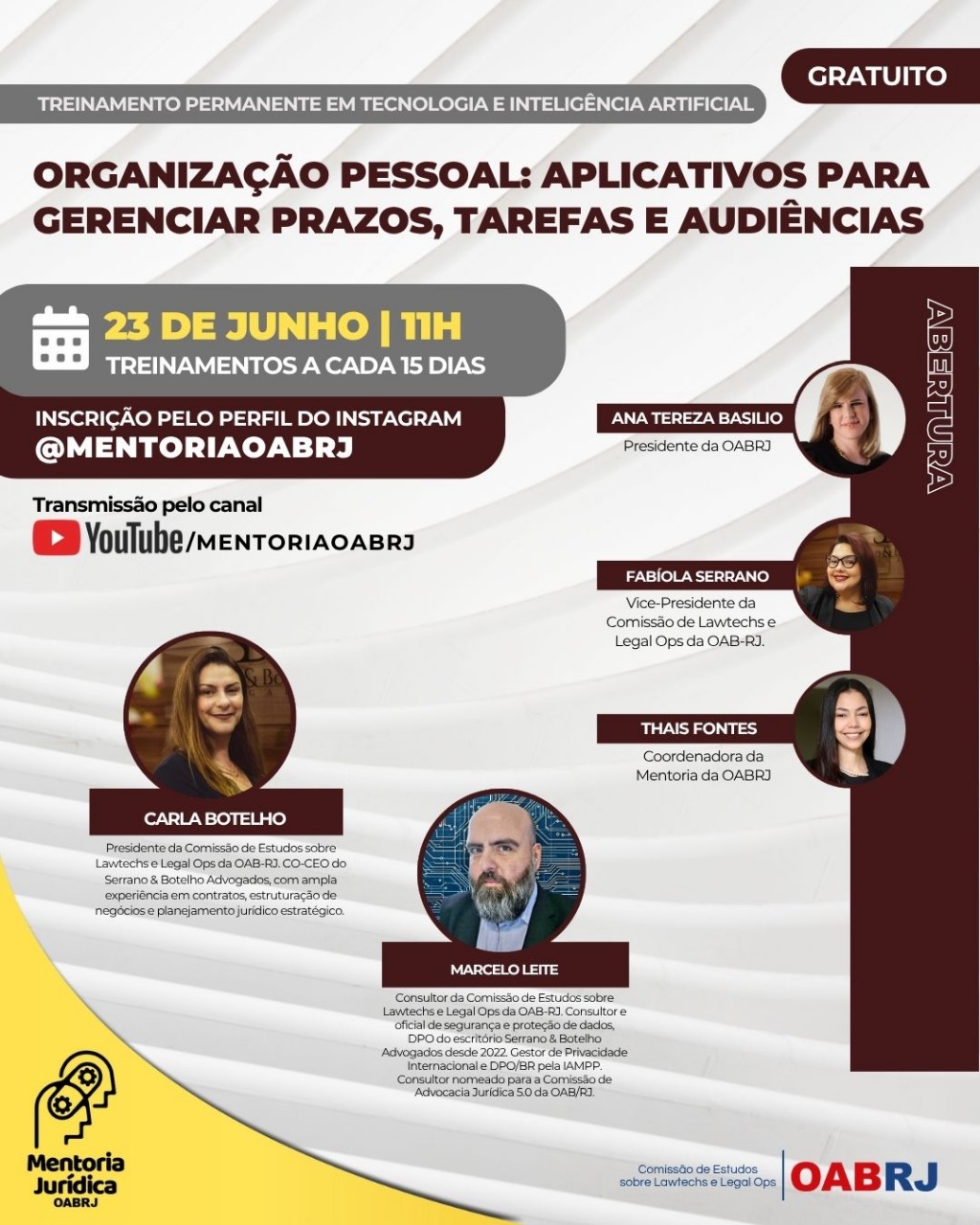 Também estarão no encontro virtual e gratuito, a Coordenadora da Mentoria, Thais Fontes, a presidente da comissão de Estudos sobre Lawtechs e Legal Ops da OAB-RJ, Carla Botelho, a vice-presidente da comissão, Fabíola Serrano, e o consultor da comissão, Marcelo Leite.