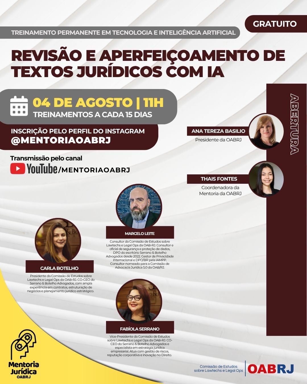 Também estarão no encontro virtual e gratuito, a Coordenadora da Mentoria da OAB-RJ, Thais Fontes, e os advogadas Carla Botelho , Fabíola Serrano e Marcelo Leite.