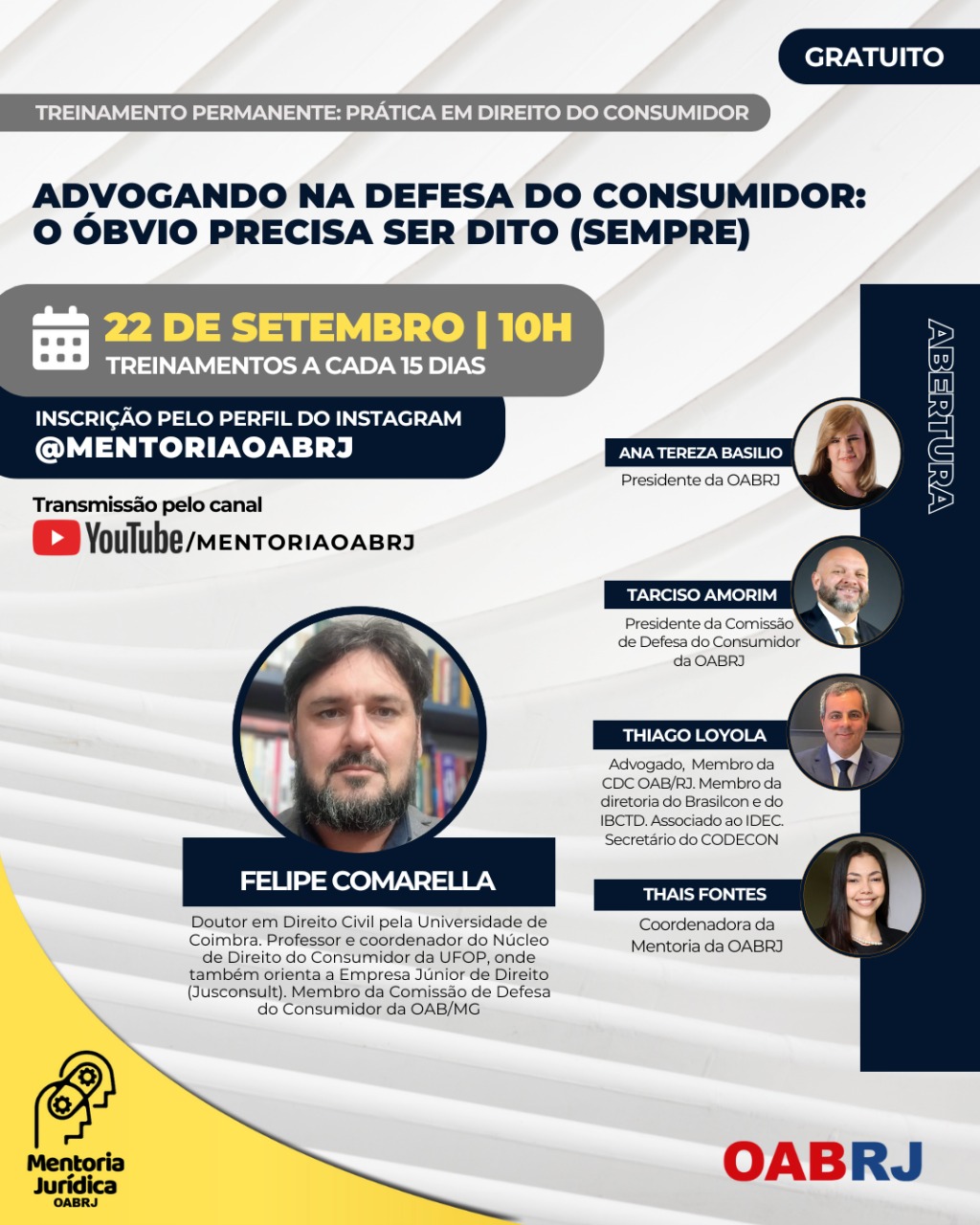 Também estarão no encontro virtual e gratuito, a Coordenadora da Mentoria da OAB-RJ, Thais Fontes, o presidente da comissão de Defesa do Consumidor, Tarciso Amorim, e os advogados Thiago Loyola e Felipe Comarella (foto).