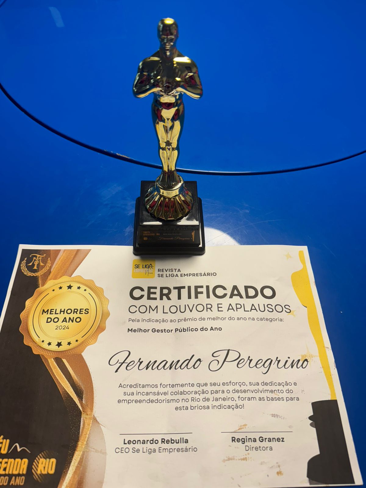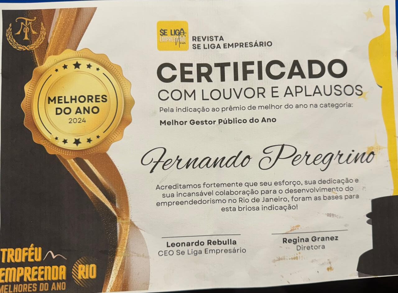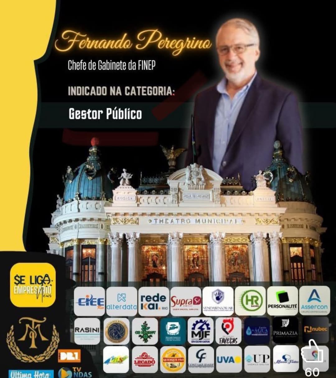 Chefe-de-gabinete da presidência da FINEP, e vice-presidente do Clube de Engenharia, Fernando Peregrino recebeu o Troféu Empreenda-Melhores do Ano, na categoria Melhor Gestor Público, em concurso promovido pela Revista “Se liga Empresário”.