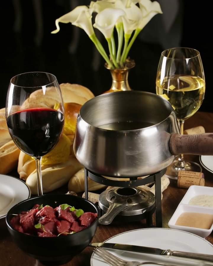 As opções, para duas pessoas, são : Fondue de doce de leite, com queijo minas, mini churros uva e morango, Fondue de chocolate, Fondue de queijo, e Fondue de carne (fotos).