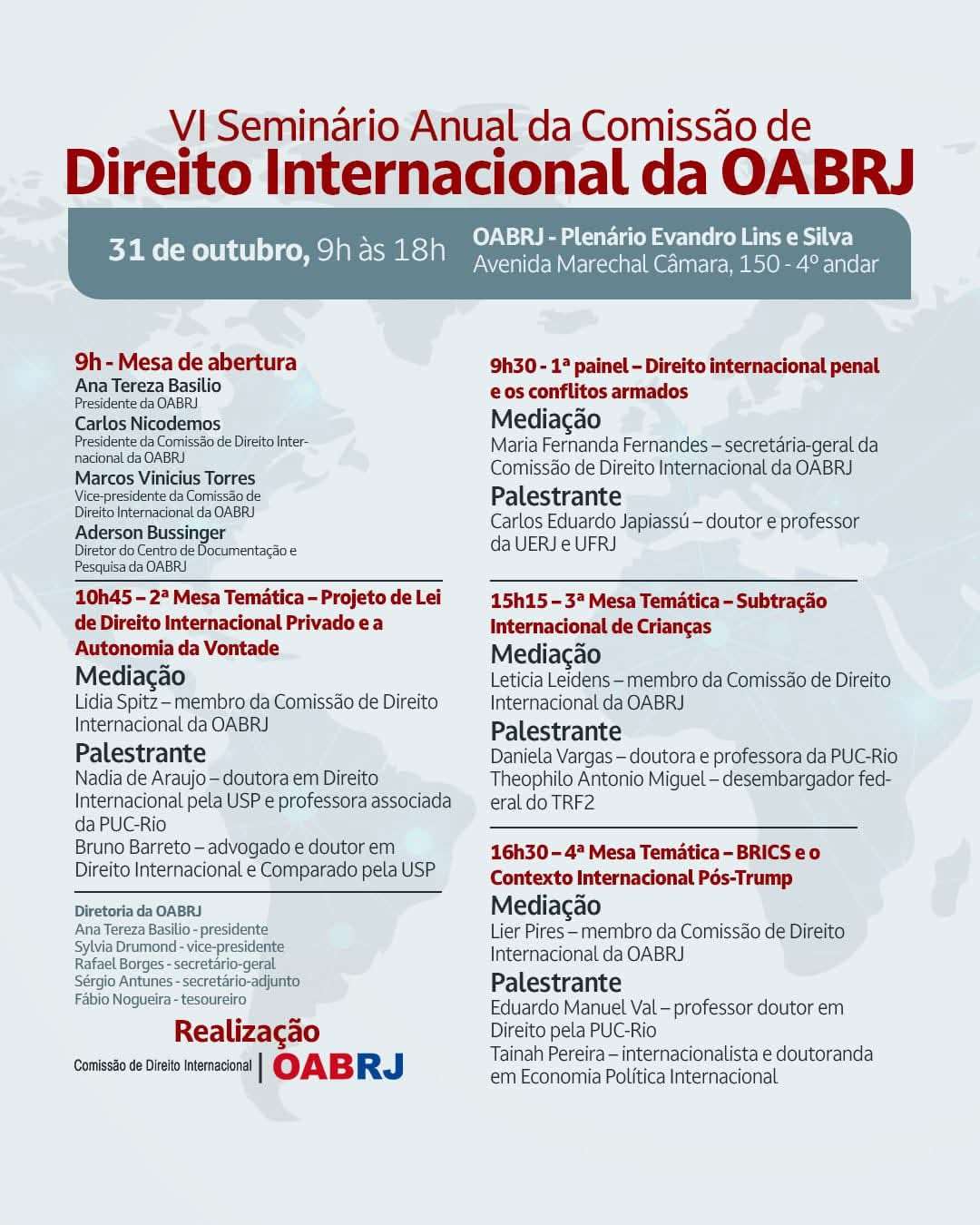 Também estarão na mesa de abertura,  o presidente da comissão de Direito Internacional da OAB-RJ, Carlos Nicodemos,  o vice-presidente, Marcos Vinicius Torres, e o diretor do Centro de Documentação,  Aderson Bussinger.
