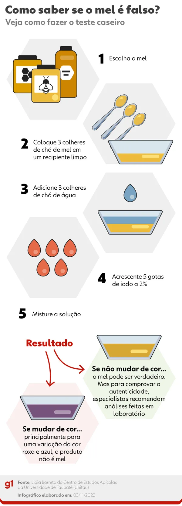 De acordo com ele, o mel que é 100% falso pode ser identificado misturando uma colher de sopa com água e algumas gotas de iodo. Após misturar esses ingredientes, se a água ficar preta, o mel foi modificado com amido, e provavelmente será vendido por um valor mais baixo que o normal.